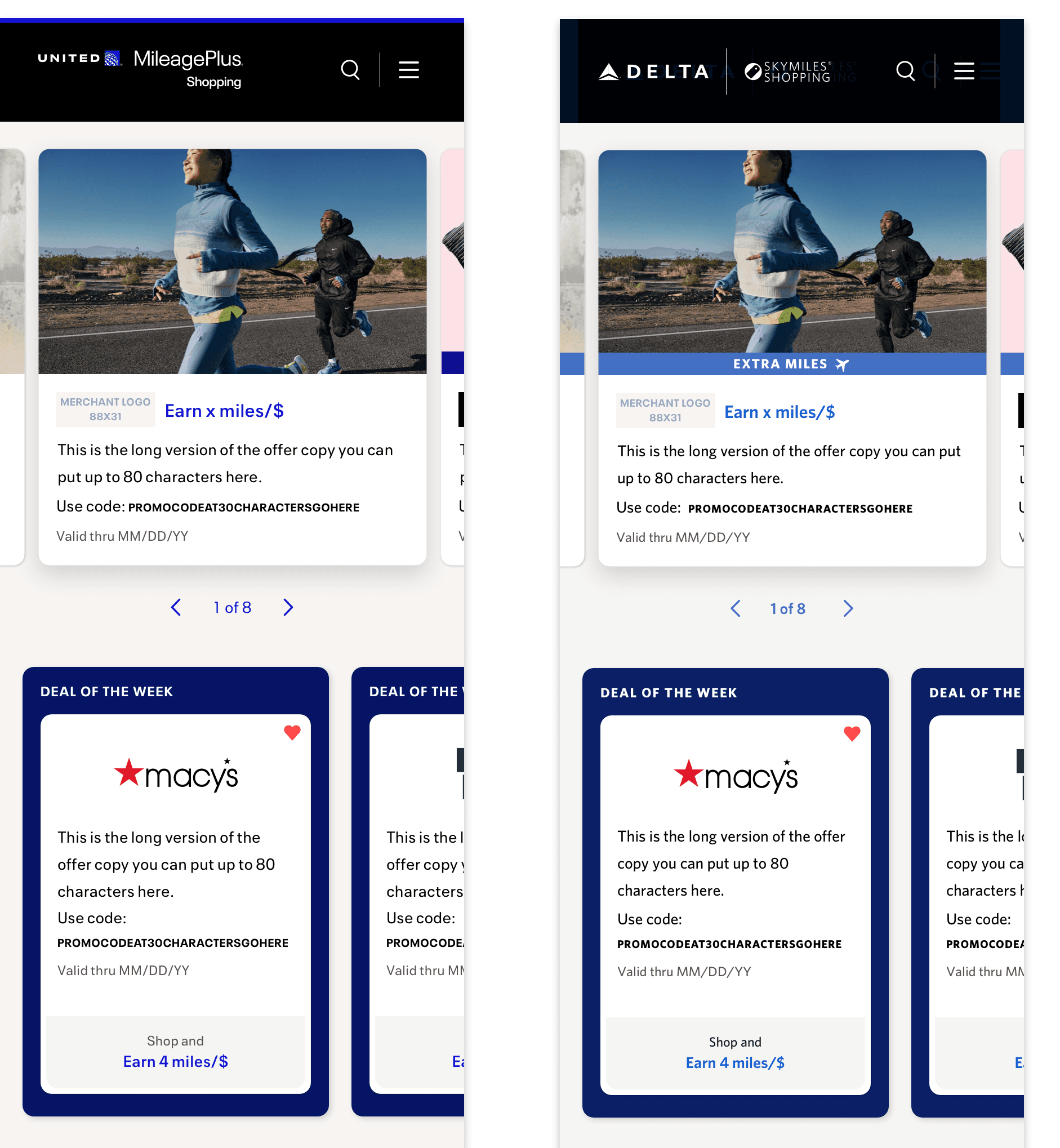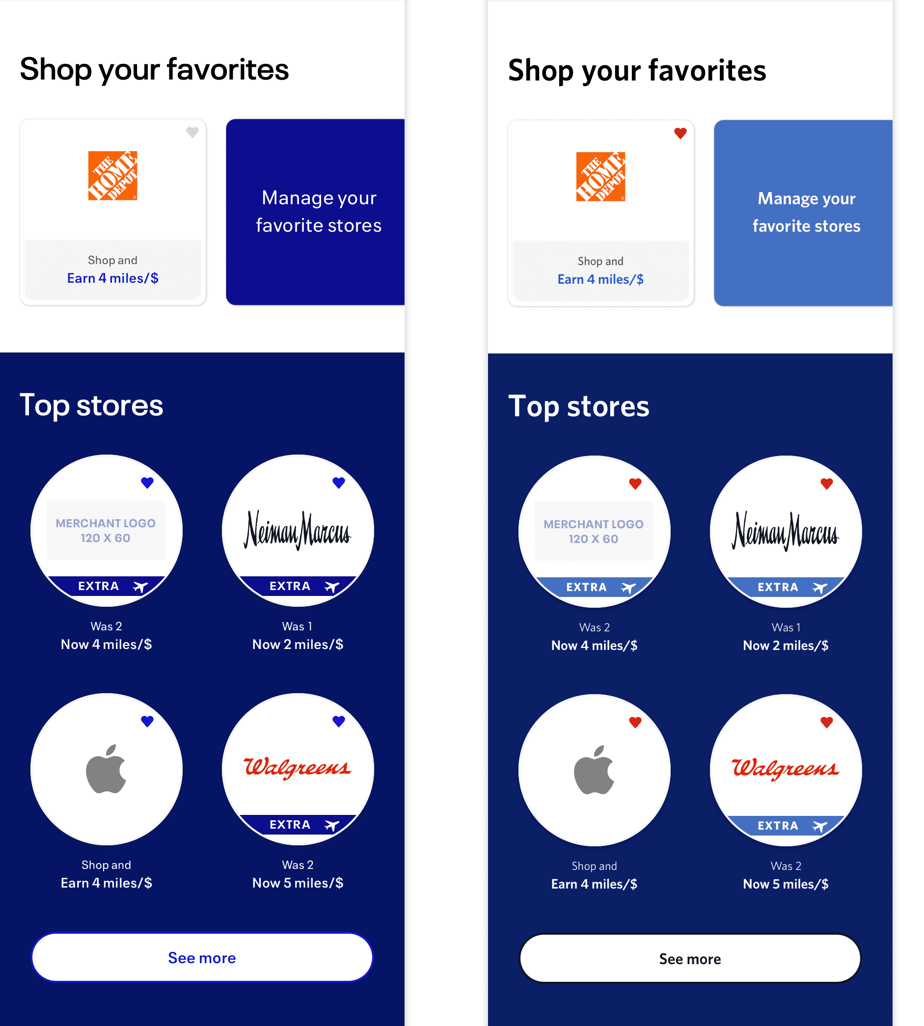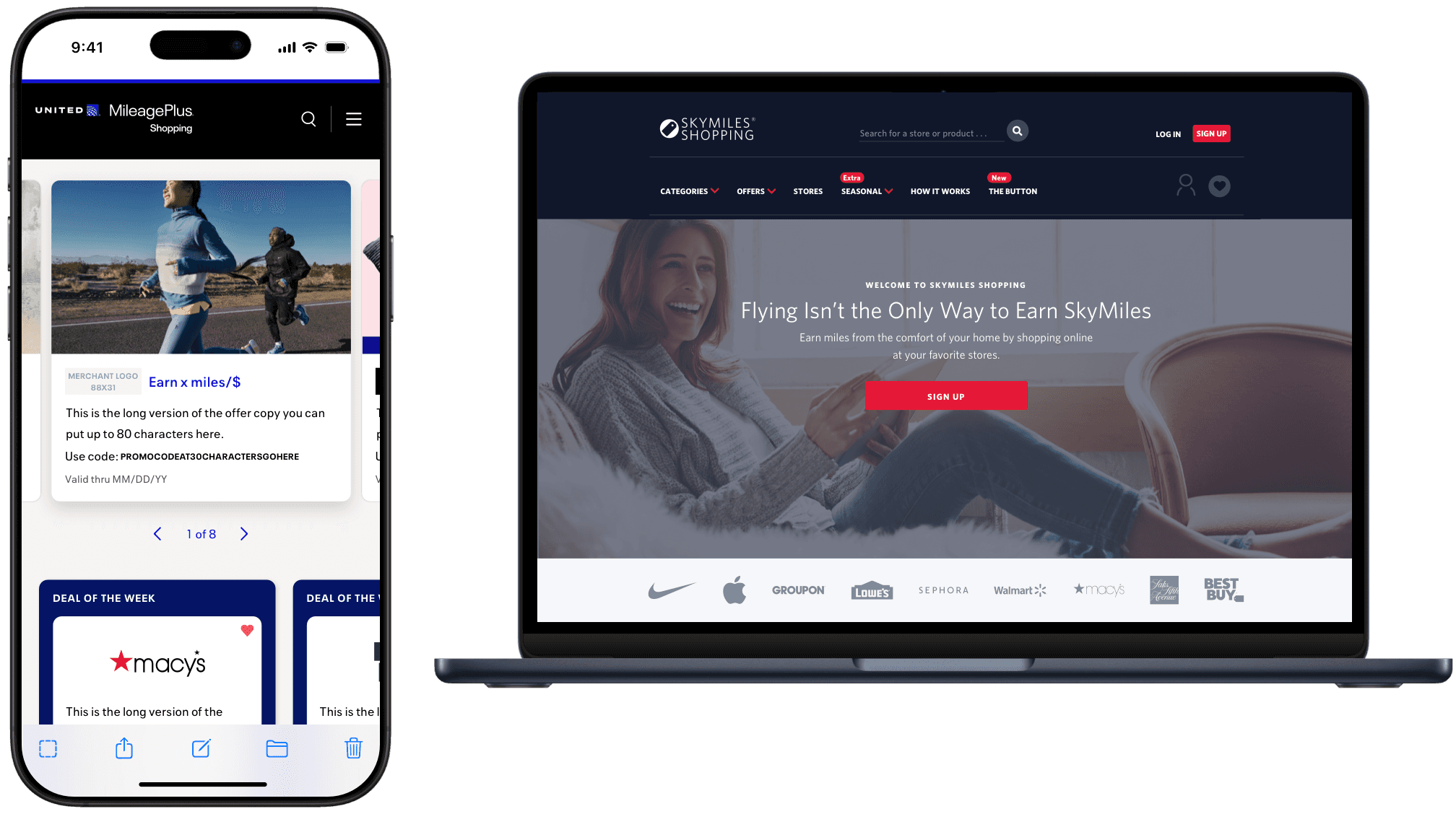 I lead design for a shared rewards and commerce platform powering shopping experiences across airlines and financial-institution partners. The work balances platform scale, partner differentiation, and a complex offer ecosystems—while keeping the experience clear, trustworthy, and easy to use across devices. I partner with product, engineering, and marketing to evolve the platform in ways that support both long-term scalability, member satisfaction, and partner-specific goals. I led platform-level UX and visual design across core shopping experiences, partner theming, and reusable patterns.